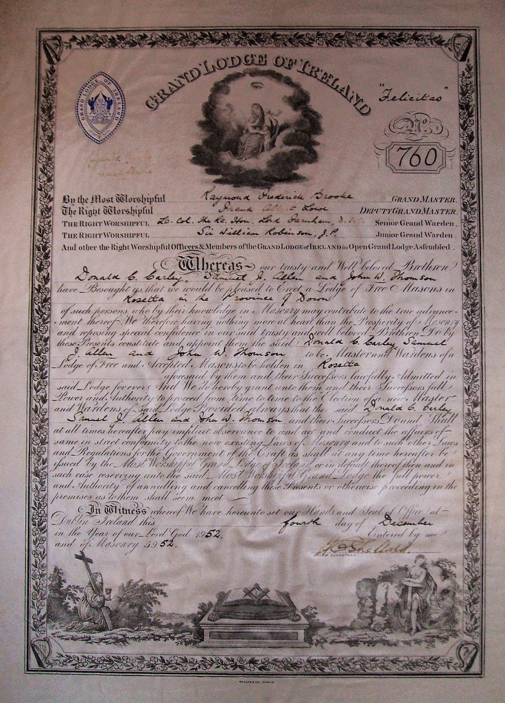 The Lodge is warranted by the Grand Lodge of Ireland and works under the auspices of the Provincial Grand Lodge of Down.
