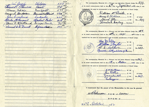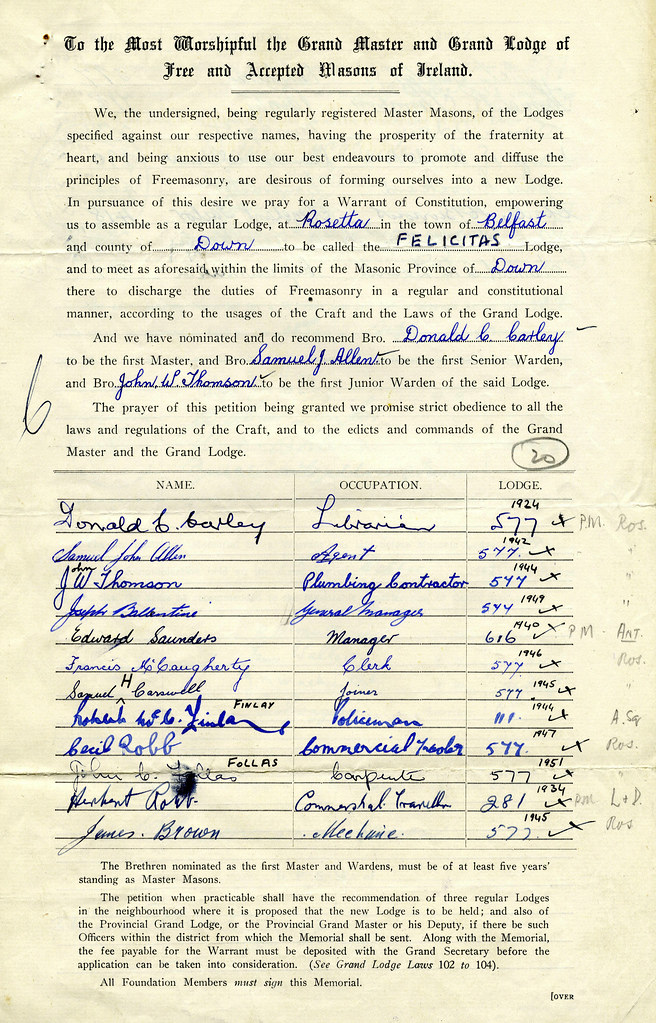 22nd October 1952 – Printed form of Memorial for a new warrant to meet at Rosetta, Belfast and to have the title “Felicitas Lodge” – Memorial signed by twenty brethren from various Lodges.